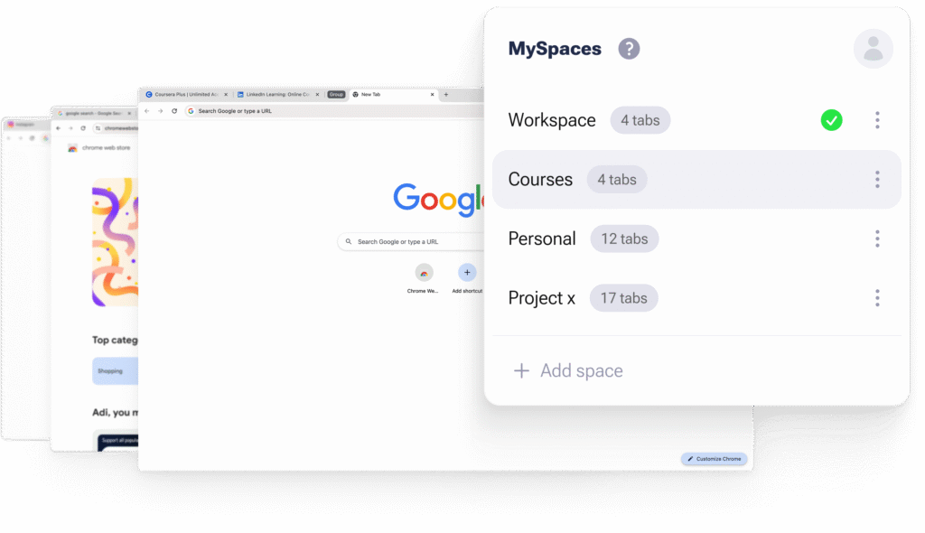 MySpaces is a Chrome extension that helps you organize and declutter your tabs, making it easier to manage your online work, study, hobbies, and personal projects.